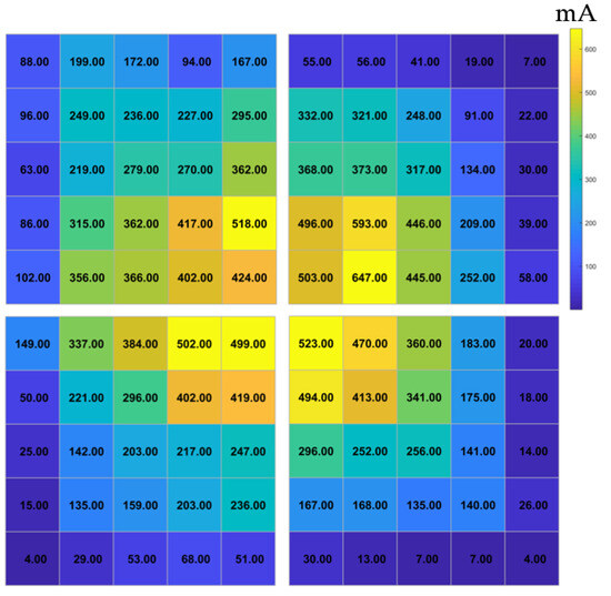 In this paper, the experimental validation is conducted in a realistic and specific setting. In this experiment, the long-range transmitting laser source is an 808 nm semiconductor laser that, after 20 m of transmission, reaches an LPC’s array composed of 100 LPCs. The arrays were divided into four 5 × 5 arrays, shown in Figure 4a. Figure 4b depicts the arrangement and number of 5 × 5 LPC arrays. Additionally, the I–V curve of the LPC’s array is tested to identify the Isc and express the graph of Isc distribution. Figure 5 depicts the obtained Isc distributions under 300 W non-uniform laser irradiation, which is a vital parameter of the optimization algorithm.