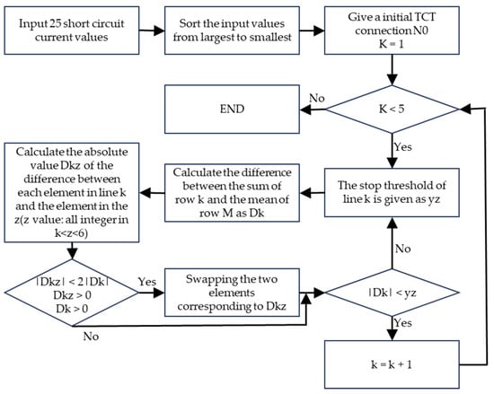There are 25 possible TCT configurations for an LPC 5 × 5 array. The combinations would be very computationally intensive and require much time if every possible combination method was to be considered. Reference [14] provides an algorithm for rapidly obtaining optimized TCT connections using a simple sorting method, but the accuracy of the optimization needs to be improved. This paper develops a more precise automatic algorithm to take advantage of the faster computation time. The algorithm proposed in [14] repeats the search calculation until the threshold value is satisfied and then terminates. In this paper, a 5 × 5 array reconstruction algorithm is obtained by optimizing the algorithm to obtain the initial array, which connects to an optimized circuit design distribution. As discussed earlier in this paper, most search algorithms for TCT architectures are either computationally expensive or provide solutions that are close to optimal only under Gaussian beam irradiation. Therefore, under non-uniform irradiation conditions, there is a need for a search algorithm that can provide optimal solutions within an acceptable time complexity. The TCT configuration algorithm proposed in this paper utilizes the concepts of irradiance balancing and current matching to establish the optimal structure. Ensuring that the sum of currents in each row is nearly equal is crucial for maximizing the output power of the PV array. This algorithm is based on the idea of array reconstruction. Figure 6 depicts the block diagram.