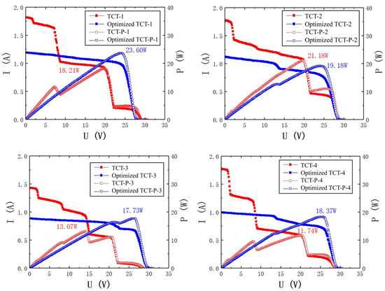 Experimental I–V and P–V curves of the optimized four 5 × 5 array (red curve is the standard TCT; blue curve is the connection after optimization using the algorithm provided in this paper).