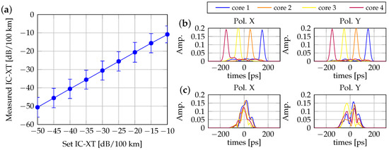 Figure 2a depicts the error bars representing the set IC-XT and the estimated IC-XT after 4000 iterations of testing. We simulated IC-XT as a Gaussian distribution with a constant variance. The perfect straight line in Figure 2a indicates the agreement between the set and measured values of IC-XT. To examine spatial mode dispersion (SMD), fiber length was set to 100 km with an SMD of 1 ps/km. During the SMD check, IC-XT should be minimized to observe inter-core skew. Separated pulses become observable when IC-XT can be ignored at a coupling length of 1000 km, as demonstrated in Figure 2b. With the SMD set at 1 ps/km with a transmission length of 100 km, the relative delay between cores was 100 ps. When the coupling length was reduced to 1 km, the received pulses of all cores are plotted in Figure 2c, indicating the advantages of strong-coupled MCF in reducing SMD compared to WC-MCF.