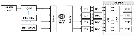 Based on the conducted numerical model of MCF transmission, we further utilized the co-simulation platform of MATLAB and Pytorch to evaluate the performance of the proposed TL-aided NNE-based MIMO-DSP. The simulation setup for the four-core MCF transmission is illustrated in Figure 3. A capacity of 1.6 Tbps was achieved using the DP-16QAM modulation format at a baud rate of 50 Gbaud. The launched optical power was set at 7 dBm. To facilitate the 100 km transmission, an optical amplifier with a noise figure of 5 dB was employed after the fan-out coupler. The fiber attenuation factor, second-order dispersion coefficient, nonlinear coefficients, and SMD were set at 0.16 dB/km, 16 ps/nm/km, 0.81 × W/m, and 27 ps/km, respectively. The coupling length of the MCF was set at 100 m to simulate strong coupling during MCF transmissions.