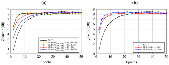 To investigate the effect of TL under different cut-off frequencies of FTN filters and coupling lengths , we set the cut-off frequency of the FTN filter (the source link) at 18.75 GHz and the coupling length at 100 m. To examine the similarity between the target link and the source link, we varied the CSI of the target link with cut-off frequencies at 16.25 GHz, 17.5 GHz, 20 GHz, and 21.25 GHz, respectively, and coupling lengths at 50 m and 200 m. Figure 4a indicates that the Q factors of the target link converge faster when cut-off frequencies are set at 17.5 GHz and 20 GHz, compared to 16.25 GHz and 21.25 GHz. This is because the TL-DFNNE performance is enhanced when the similarity between the source link and the target link is greater. Additionally, the initial Q factor of the target link with a cut-off frequency of 17.5 GHz demonstrates approximately a 5 dB improvement compared to the source link, resulting in approximately an 83.3% improvement in convergence speed at a Q factor of 8 dB.