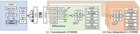 Experimental validation of the simplified MIMO-DSP in four-core MCF links by orthogonal pulse shaping. Insets: (i) Conventional MIMO-DSP with the assistance of TDM receiver. (ii) Independent MIMO-DSP modules enabled by orthogonal pulse shaping.