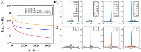 Symbol rates were set at 8 Gbaud, corresponding received signal power was −20 dBm, and the LO power was 0 dBm. Due to the rotation of state of polarization, the dimensionality of the full MIMO-DSP for four-core MCF link was 8. As indicated in Figure 6a, the full-MIMO structure exhibits the lowest converged values compared to the other two methods. If IC-XT was not well mitigated, MSE of the independent 2 × 2 MIMO-DSP modules was the worst case due to the strong IC-XT. With the assistance of orthogonal pulse shaping, MSE performance was improved with a lower converged value and faster convergence by using the deconstructed 2 × 2 MIMO-DSP modules. Moreover, the difference in the shape of constellations after orthogonal pulse shaping, which is depicted in Figure 5, is beneficial for the MSE convergence. By using the full-MIMO structure and independent 2 × 2 MIMO-DSP modules with IC-XT cancellation, the corresponding 1-sample/symbol taps after 10,000 iterations are shown in Figure 6b,c, respectively. As indicated by the taps of the full-MIMO structure, the pulse spreading due to DGD and IC-XT covers more than 50 symbols. With the IC-XT cancellation, the 2 × 2 MIMO-DSP taps has shorter coverage, which is also beneficial to reduce the MIMO-DSP complexity in addition to the MIMO dimensionality reduction.