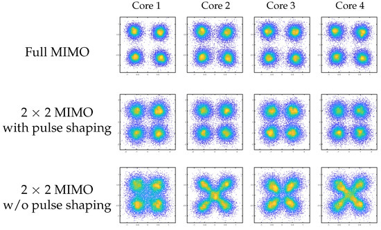 To investigate the performance of the simplified MIMO-DSP structure enabled by IC-XT cancellation, constellations of signals transmitted over 10-km MCF are shown in Figure 7. The full-MIMO structure exhibits the best performance with the clearest constellations. Due to the existence of random IC-XT, the independent 2 × 2 MIMO-DSP struggles to recover the coupled signals along with the inconsistent performance of four cores. Thanks to the IC-XT suppression, clearer constellation can be obtained by orthogonal pulse shaping.