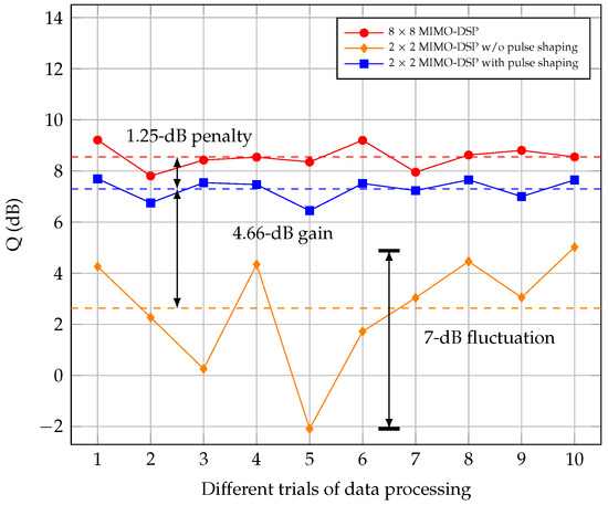 As mentioned above, the IC-XT exhibits significant randomness during the crosstalk matrix measurement, which can lead to outage probability in SDM links if not well mitigated. Consequently, we recorded the Q factors through several trials to process the time-variant data sequences. The Q factors of the recorded signals transmitted over MCFs at −20 dBm power are shown in Figure 8 using different MIMO-DSP structures. It indicates that the fluctuation of Q factors is about 7 dB by using 2 × 2 MIMO-DSP without IC-XT cancellation, which is harmful to the outage performance of transmissions. As for the full-MIMO structure and 2 × 2 MIMO modules with orthogonal pulse shaping, Q factor fluctuations are reduced to 1.8 dB and 1.2 dB, respectively. Compared to the full-MIMO structure, a 1.25 dB Q penalty is observed by using the deconstructed 2 × 2 MIMO-DSP modules. Nonetheless, the stable IC-XT cancellation induces an over 4.6 dB Q factor gain by using the simplified 2 × 2 MIMO-DSP modules.