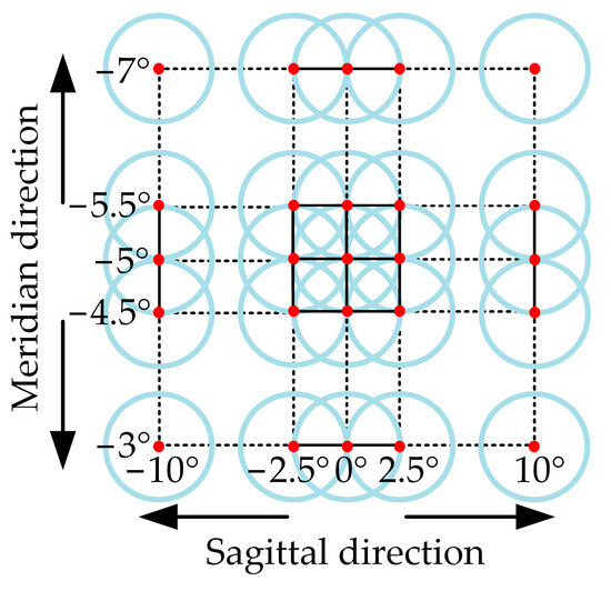 According to “System 1” and the FOV required by the optical system, the FOV is set to expand in the meridional direction with a step length of 0.5° (half of the FOV) and in the sagittal direction with a step length of 2.5° (half of the FOV). And designers can determine the step length based on the design requirements and the optimization time cost. The schematic diagram of the FOV expansion process is shown in Figure 6.