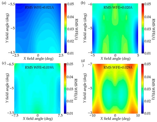 First, we set the error sensitivity constraint for the first round of FOV expansion. The RMS WFE of “System 1” is shown in Figure 8a. The MF of “System 1” is 0.866, which is set as the threshold for the error sensitivity evaluation. The FOV of “System 1” is expanded to 10° × 2°, with a total of 25 sampling FOVs. The RMS WFE of the image quality degrades to 0.028λ while still meeting the image quality requirements. However, the calculated MF’ is 0.883, which exceeds the desired MF threshold. To control MF′ < 0.866, the image quality is optimized, resulting in “System 2” with an MF of 0.831 and an RMS WFE of 0.021λ, as shown in Figure 8b.