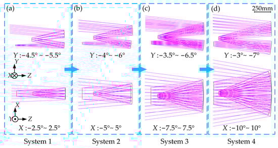 The optimization process for error sensitivity during FOV expansion has yielded four intermediate results, referred to as “System 1” to “System 4”, all of which exhibit good image quality. Throughout the process of expanding the FOV, the image quality in “System 1”, “System 2”, “System 3”, and “System 4” is uniformly distributed. The layout of these systems is shown in Figure 9. The systems have a total length less than the focal length of 1000 mm, satisfying the structural constraints.