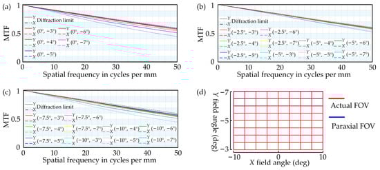 “System 4” is the final design result that meets the requirements of the optical system specifications. The image quality of “System 4” is symmetric about the Y axis, the image quality of half of the FOV can be extended to the full FOV. The MTF of “System 4” is shown in Figure 10a–c, the MTF values for each FOV in the optical system meet the requirements of 0.45@50 lp/mm. The grid distortion of “System 4” is shown in Figure 10d, with a maximum distortion of 0.5%. The distortion is controlled within a very small range.