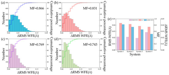 (a–d) Optical system error sensitivity distribution for “System 1” to “System 4”; (e) MF, RMS WFE and ΔRMS WFE comparison chart for “System 1” to “System 4”.