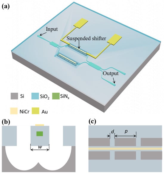 Our SiNx suspended MZI is shown schematically in Figure 1a. It was designed on a silicon substrate with a 3 μm thermal silicon oxide layer and a SiNx thickness of 180 nm. The top-view and cross-section schematics of the proposed phase modulator are shown in Figure 1b,c, respectively. The MZI structure is used to measure the TO tuning performance of the phase modulator with NiCr heating resistors, connected by gold wiring and bonding pads. The waveguide width is 300 nm. The width of the suspended SiO2 waveguide beam is w, while a window of length p and spacing d is cut through the silicon oxide in order to further etch the substrate below the waveguide. The spacing d serves as the supporting arm that connects the suspended waveguide beam to the surrounding structure.