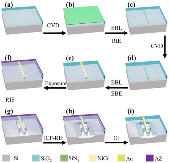 To fabricate the suspended MZI, the process began with the deposition of 180 nm of our proprietary [32,33] (Figure 3a) inductively coupled plasma chemical vapour deposition (ICPCVD) SiNx on a silicon substrate layered with 3 µm of thermal silicon oxide, as presented in Figure 3b. Subsequently, the pattern was defined by means of electron beam lithography (EBL) and transferred into the SiNx layer via reactive ion etching (RIE), as depicted in Figure 3c.