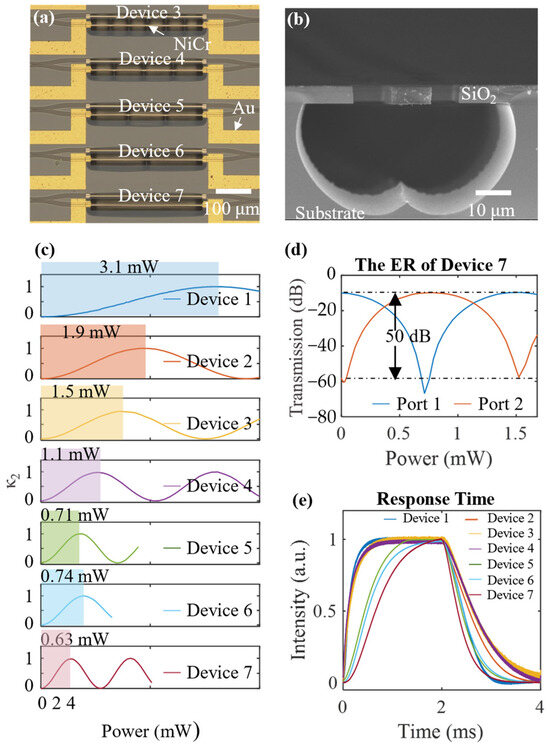 (a) Microscope photograph of a representative device. (b) SEM photograph of a cross-section of a suspended structure. (c) The tested Pπ of Devices P1 and P2 are the optical power of the two output ports of the MZI κ2 = P2/(P1 + P2). (d) The extinction ratio for Device 7. (e) The tested response time of devices at λ = 532 nm.