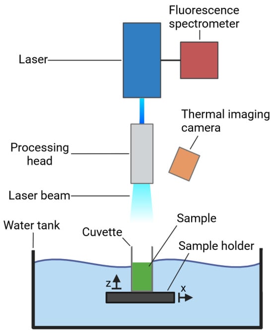 High-power blue light laser irradiation setup. The sample to be tested was transferred into the quartz cuvette which was subsequently placed onto the sample holder and moved to the centre of the irradiated area. The processing head allowed for the modification of the laser beam according to the desired intensity. The thermal imaging camera was set up to measure the temperature development of the sample in the cuvette. The fluorescence emission was assessed via an optical fibre coaxially coupled to the laser optics, leading to the fluorescence spectrometer. The figure was generated using bioRender Software.