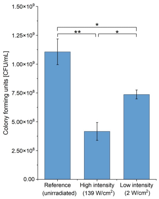 Dose-dependence of the antibiotic effect of high-power blue laser radiation during the treatment of E. coli cultures. Colony forming units (CFU) of E. coli K12 DSM498 before and after irradiation are shown. High intensity was 8.9 s, 139 W/cm2. Low intensity was 600 s, 2 W/cm2. Total energy dose for all samples was 1240 J/cm2. Asterisks (*) indicate the significance value of the results (* p < 0.05; ** p < 0.01).