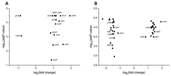 Volcano plot displaying the differentially expressed genes and their corresponding adjusted p-values of E. coli K12 DSM498 following 5 s (panel (A)) and 20 s (panel (B)) irradiation with high-power blue laser radiation (310 J/cm2 and 1240 J/cm2 respectively, 62 W/cm2). A cut-off of logFC |0.8| was set for differential expression. Relevant genes were labelled.