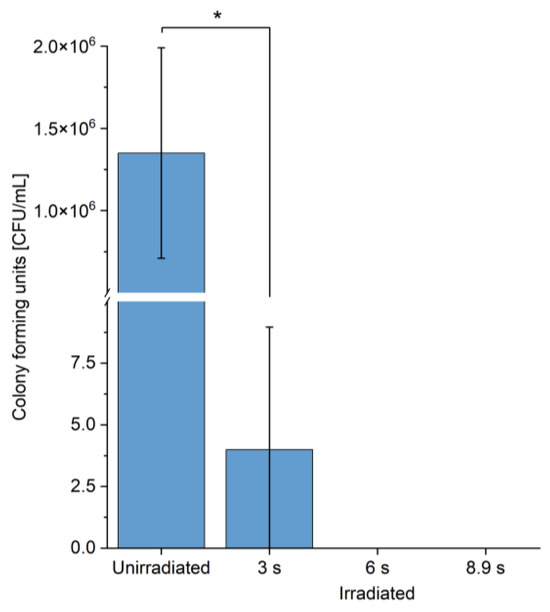 Blue laser-mediated inactivation of green algae in seconds. Colony forming units of C. reinhartii before and after irradiation. Irradiation times: 3 s, 6 s, 8.9 s, intensity: 139 W/cm2. Asterisks (*) indicate the significance value of the results (* p < 0.05).