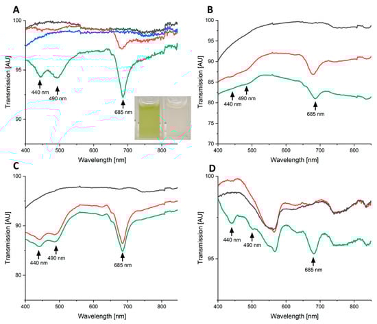 Transmission spectra of high-power blue light laser irradiated green and red algae. Transmission spectra of the green algae C. fusca (panel (A)), C. reinhardtii (panel (B)), Oocysis sp. (panel (C)), and the red algae P. purpurea (panel (D)) are shown. The green lines represent spectra of untreated cells, the black lines spectra of high intensity blue light (139 W/cm2, 8.9 s) treated cells, the blue line in panel (A) spectra of low intensity blue light (2 W/cm2, 8.9 s) treated cells, and the red lines spectra of high intensity blue laser radiation (139 W/cm2, 8.9 s) treated cells in the presence of 1 mM ascorbic acid. A linear baseline adjustment was carried out manually. Total energy dose for all irradiated samples was 1240 J/cm2. The inserted picture in panel (A) shows C. fusca suspensions before (left) and after (right) irradiation.