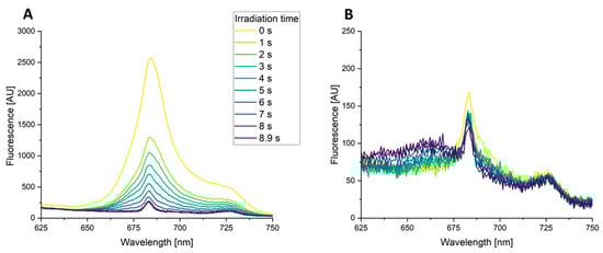 A central spectroscopic method to determine the basis of photobleaching is fluorescence spectroscopy [73]. To gain additional information about the effect of high-power blue laser radiation on chlorophylls in our algae, the fluorescence spectra of the freshwater green algae C. fusca and the marine red algae P. purpurea were measured. The high-power blue laser (448 nm, 139 W/cm2, 8.9 s) served as the excitation source, and the corresponding fluorescence emission was recorded between 500 nm and 800 nm. The obtained fluorescence signals recorded for C. fusca revealed the time-dependent diminishing of two peaks at 685 nm and 725 nm (Figure 6A). These fluorescence emission peaks with the employed excitation wavelength of the laser (448 nm) are typical for fluorescent chlorophyll a in accordance with the literature [77,78]. The peak at 685 nm is caused by chlorophyll a of photosystem II, while the peak around 725 nm can be attributed to chlorophyll a of antenna of photosystem I [78]. In agreement with the results of the transmission results, the fluorescence spectroscopy results indicated that chlorophyll is damaged and bleached during the blue light laser irradiation process.