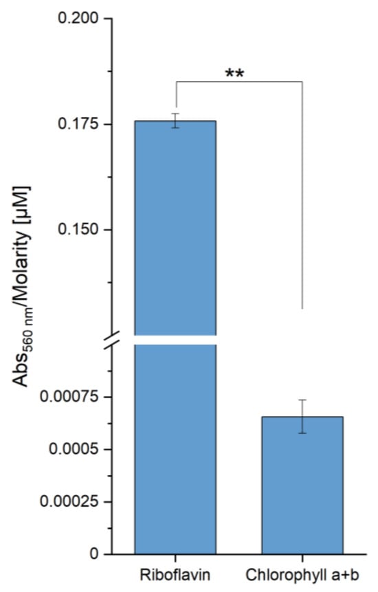 In vitro detection of superoxide radicals via NBT-Assay with riboflavin and extracted chlorophyll after blue light irradiation. A volume of 1.65 mL nitrobluetetrazolium (NBT) solution (14 mg/mL NBT, 1.5 mg/mL L-methionine in 100 mM potassium phosphate buffer, pH 7.8) was added to 850 µL solution of the chromophores (Riboflavin, 11.7 µM in buffer) and extracted chlorophyll (50.75 µM in 10% (v/v) acetone) and irradiated with a power of 300 W blue light (448 nm) for 5 s. The absorbance resulting from the superoxide-dependent colour development of NBT was recorded at 560 nm. Asterisks (*) indicate the significance value of the results (** p < 0.01).