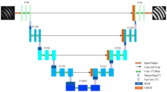 This process involved the use of an attention mechanism [17], a technique that emphasizes key information by assigning different weights to individual features to improve model accuracy. Attention mechanisms have been widely used in various deep learning tasks, such as computer vision and natural language processing. The convolutional block attention module (CBAM [18]) divides this attention step into two separate components, a channel attention module and a spatial attention module, which not only preserves parameters and computational power, but also facilitates integration into existing network architectures as a plug-and-play module. This inclusion typically improves extraction accuracy and network generalizability. The bottleneck attention module (BAM [19]) was developed by the same group that proposed CBAM. While these frameworks are similar, the CBAM module can be described as a series connection of channel attention and spatial attention modules. In contrast, the BAM module can be viewed as a parallel connection (see Figure 1 and Figure 2). The DN-U-NET network structure is shown in Figure 3, where the input consists of interference fringes with a certain background intensity, fringe amplitude, and added ambient noise. The output includes corresponding interference fringes in an ideal state.