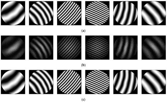 Six different sets of fringes were processed using DN-U-NET, as shown in Figure 4. Specifically, Figure 4a shows fringe samples in an ideal state, in which the background intensity and fringe amplitude are constant. Figure 4b shows fringes before processing, in which the background intensity and fringe amplitude (in the form of a Gaussian function) were added along with Gaussian noise. Figure 4c displays corresponding results after processing with DN-U-NET. Visual inspection suggests that the processed fringes exhibit improved contrast while noise was suppressed significantly, producing results that are more similar to the ideal fringes.