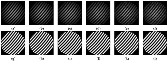 A comparison of fringe patterns before and after processing at different noise levels. (a) Before processing (noise level = 0). (b) Before processing (noise level = 0.05). (c) Before processing (noise level = 0.07). (d) Before processing (noise level = 0.09). (e) Before processing (noise level = 0.12). (f) Before processing (noise level = 0.15). (g) After processing (noise level = 0). (h) After processing (noise level = 0.05). (i) After processing (noise level = 0.07). (j) After processing (noise level = 0.09). (k) After processing (noise level = 0.12). (l) After processing (noise level = 0.15).