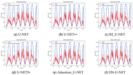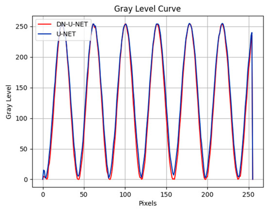 In addition to the use of simulated fringes, DN-U-NET performance was evaluated with a series of experimentally collected fringe maps, as shown in Figure 8a. The original interference fringe pattern was collected using a ZYGO-Verifire PE Fischer-type phase-shifting interferometer, using different networks, the Zygo original interference fringes are processed, respectively, and the processing results are shown in Figure 8. Through visual observation, several models can significantly enhance their stripe contrast and significantly suppress noise when processing the Zygo original interference fringe. In order to compare the effect before and after processing, the results of several different models are compared with the gray scale distribution curve of the 128th line before and after processing, and the comparison results are shown in Figure 9. In addition, the processing results of the U-NET network are compared with the processing results of the DN-U-NET proposed in this paper, and the comparison results are shown in Figure 10, which shows that the gray level distribution of the interference fringes after the processing of the model proposed in this paper is smoother and more average.