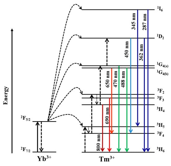 In order to obtain effective anti-Stokes luminescence, it is necessary to dope nanoparticles with a pair of active rare earth elements, one of which has a large absorption cross-section (sensitizer), and the other has intense luminescence (activator). The sensitizer absorbs the exciting radiation and transmits the excitation to the activator. Ytterbium ions are often used as sensitizers, and thulium, erbium or holmium ions are used as activators [21,22,23]. Unlike nonlinear optical processes that occur by means of quasi-virtual energy levels, up-conversion occurs by means of real energy state. At the same time, various mechanisms take place: energy transfer followed by absorption from the excited state, the consecutive transfer of excitation energy, cross-relaxation up-conversion, cooperative sensitization and cooperative luminescence [24]. The scheme of the electronic levels of the sensitizer (ytterbium) and activator (thulium) and the mechanisms of excitation transmission are shown in Figure 1. One of the most effective matrices for doping are nanopowders with a crystal structure of the gagarinite type based on NaYF4 [25] and NaGdF4 [26]. The NaYF4 matrix is actively used for biological tissue structure visualization and photodynamic therapy [10,11,12,13].