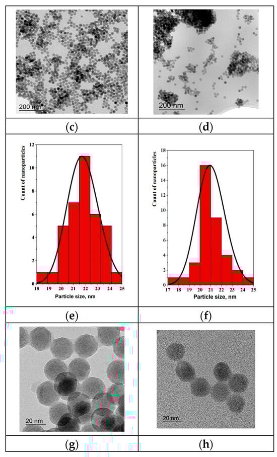 The morphology, particle size distribution and the presence of the crystal structure were studied using a JEOL JEM-2100 transmission electron microscope (Figure 2). The presence of the crystal structure was confirmed by X-ray diffraction data on the example of samples 7 and 8 (Figure 2a and Figure 2b, respectively), shown in Figure S1a,b. X-ray diffraction analysis (XRD) was performed on a Bruker D8 Advance diffractometer using CuKα radiation. The unit cells parameters (a) and the coherent scattering region (CSR) were calculated using the TOPAS software 4.2 (Table S3). The synthesized samples in comparison to JCPDS card #16-0344 (a = 5.96 Å, c = 3.53 Å) demonstrated a single-phase solid solution with a hexagonal (gagarinite) structure without additional phases. The calculated unit cell parameters corresponded to JCPDS data with slight displacement, which confirms the formation of solid solutions. The particle size distribution was determined based on 60 particles in the ImageJ software 1.53 based on typical microphotographs of samples 7 and 8 (Figure 2c,d,e,f, respectively) and Figure S2. The average particle sizes were 21.9 ± 2.8 nm and 21.1 ± 3.1 nm for samples 7 and 8, respectively. The measured sizes converge with microphotographs at high magnification (Figure 2g,h). The average particle sizes based on TEM and CSR estimates are correlated with each other.