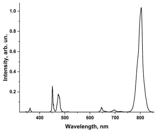 The spectrum comprises a whole set of bands with maximums at wavelengths 804, 695, 650, 476, 488, 452, 345, 362 and 345 nm corresponding to luminescent transitions of thulium: 3H4→3H6, 3F3→3H6, 1G4(b)→3F4, 1G4(a)→3H6, 1G4(b)→3H6, 1D2→3F4, 1I6→3H5. Bands near 800, 450 and 475 nm are most intensive, and they can be used for biomedical applications and biovisualization [7,8,9,14]. The band in the region of 800 nm is interesting because it is the most intense and is located in the “transparency window” of biological tissues. Luminescence bands with maximums in the region of 450 and 475 nm are thermally coupled [47] and can be used as temperature sensors [15,51].