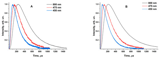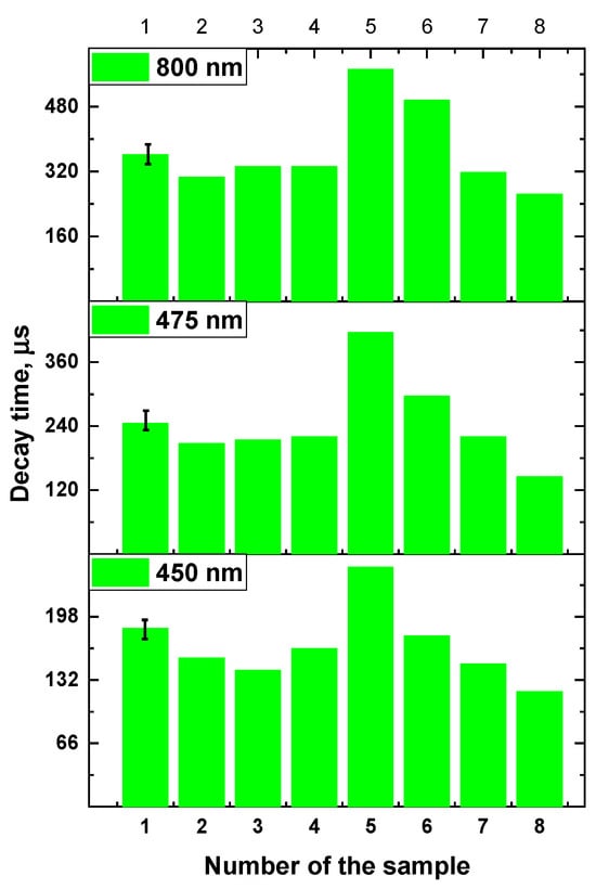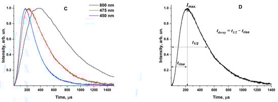 The calculated values of the signal rise time for luminescence bands with maximums in the regions of 450, 475 and 800 nm for all samples are shown in Figure 5 and in Table S1.