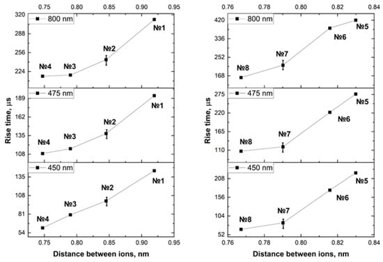 As it can be seen in Figure 6, the increase in the distance between ions leads to the increase in the rise time of luminescence intensity due to the decrease in the efficiency of energy transfer from sensitizers to activators.