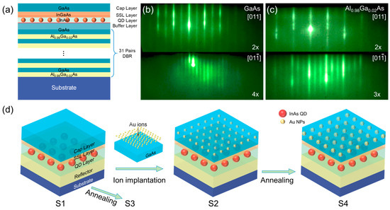 (a) Structural schematic diagram of InAs/GaAs QD-SESAM; RHEED images during DBR growth; (b) GaAs; (c) Al0.98Ga0.02As; (d) sample fabrication diagram.