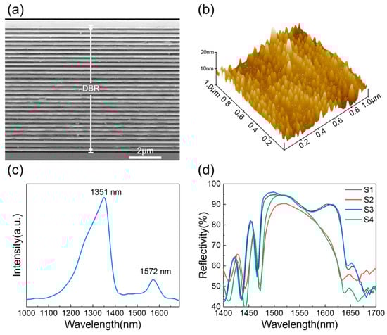 Figure 2a illustrates the cross-sectional configuration of S1, showcasing a distinct DBR structure comprising 31 pairs of alternating light and dark stripes. Notably, the bright stripes are GaAs, while the dark stripes are Al0.98Ga0.02As. The AFM image of the InAs QD layer is presented in Figure 2b, revealing a relatively high point density of approximately 4.4 × 1010 cm−2 and an observable size distribution among the growing points. Most QDs exhibit an average height of 7.5 nm and an underside width of 40 nm. The PL spectrum of S1 is shown in Figure 2c, revealing two distinct emission peaks at 1351 nm and 1572 nm, which correspond to the SSL and the QD layers, respectively. The reflection absorption spectrum of different QD-SESAM samples is presented in Figure 2d. From the figure, it is evident that all samples exhibit significant light absorption near 1575 nm. Notably, S2 and S4, which incorporate Au/GaAs Schottky heterojunctions, demonstrate enhanced light absorption compared to S1 and S3, suggesting that introducing a Au/GaAs Schottky heterojunction structure promotes light absorption. The overlapping absorption curves of S3 and S1 indicate that the annealing process employed in the experiment has a negligible impact on the QD layer. The decrease in maximum reflectance observed for S2 can be attributed to stress induced by Au ion implantation. However, after annealing treatment, the maximum reflectance of S4 recovers significantly, indicating the effective relief from implantation-induced stress. Furthermore, owing to its superior light absorption characteristics relative to S2, it is apparent that S4 possesses more significant potential as a saturable absorber (SA).