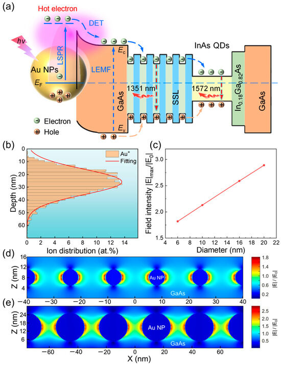 (a) Schematic representation of the transfer mechanism of photogenerated carriers in Au/GaAs Schottky heterojunction samples; (b) SRIM simulation results of Au ion distribution; (c) variation in Emax field intensity for different Au NP diameters simulated by FDTD; FDTD simulation of 6 nm (d) and 20 nm (e) diameter Au NPs with near-field distributions.