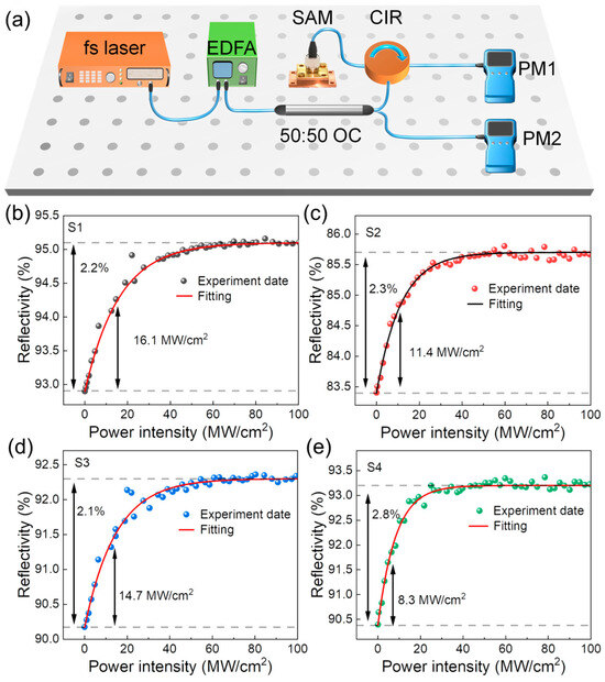(a) Schematic representation of a device for measuring nonlinear optical absorption; nonlinear reflection and fitting curves of S1 (b), S2 (c), S3 (d), and S4 (e).