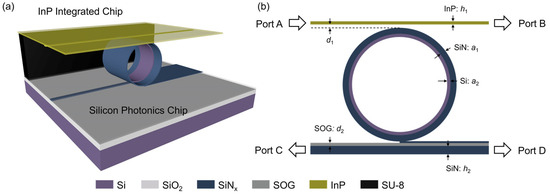 In previous work, we proposed a 3D heterogeneous photonic integration scheme that employed monolithically integrated SiNx vertical microring couplers (VμRCs) on a silicon photonic ridge waveguide for interlayer coupling [15,17,18]. This integration scheme enabled the silicon photonic layer to access the active functionalities best suited to be implemented in the compound semiconductor material platform. Additionally, an efficient axial confinement approach was introduced, resulting in a vertical microring coupler that exhibited increased resonant mode spacing and single-mode operation in the telecommunication C-band and S-band [17]. However, these investigations focused on the coupling of microrings to the bottom silicon photonic waveguides. In comparison, we have extensively investigated InP semiconductor lasers; successfully demonstrated lasing in a hybrid square–rectangular laser configuration; analyzed the noise properties of the laser; and explored its potential applications in optical computing, optical logic, and various other application domains [23]. Research on transmitting optical signals from the active photonic device plane to the vertical microring and then coupling the microring to the passive silicon photonic device layer has not yet been carried out and is the focus of this article.