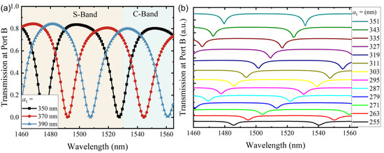 For the study of the above model, we use the two-dimensional Wave Optics module in the commercial COMSOL Multiphysics simulation software based on the finite element method for analysis and research (https://www.comsol.jp/). Among the indices, the effective refractive indices of a-Si, SiNx, SOG (Spin-on-Glass), and InP are 2.44, 1.9, 1.5, and 3.2, respectively, which are all obtained from measurements taken in previous experiments [17]. The inner diameter of the microring is taken to be 6.5 μm in accordance with the experimental results presented in [15,17,18], which can be adjusted by the differential stress within the SiNx bilayer. The spectral position of the coupling wavelength is controlled by the structural parameters of the VμRC. In Figure 2a, we present the transmission spectra of three VμRCs, whose sidewall thickness a1 = 350, 370, and 390 nm. One may notice that when a1 is 370 nm, the two resonant peaks of the VμRC align precisely within the communication range of the S-band and C-Band, and the FSR of the VμRC is determined to be 52 nm, which matches very well with our previous experimental observation [17]. Using the same model, we calculated the transmission spectra of a series of VμRCs with different total thicknesses of the SiNx layer, a1, shown in Figure 2b. This result is consistent with what we observed experimentally [18].