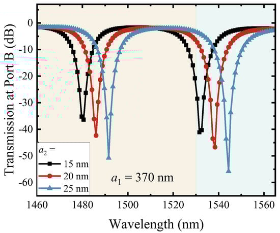 We have demonstrated experimentally that depositing a high-refractive-index thin silicon layer on the inner side of the silicon nitride microring results in increased axial confinement. The high-index strip within the microtube increases the effective refractive index locally. Therefore, the refractive index profile along the axial direction exhibits discontinuity similar to a step-index waveguide, which will help to confine the electromagnetic field within the high-refractive-index region and effectively form a vertical microring instead of a tube. In our previous experiment, we successfully achieved this by depositing a 21 nm a-Si thin film inside a VμRC [17] and observed a greatly increased FSR. However, the thickness of this silicon layer (a2) also affects the radius of the VμRC, which, in turn, is related to the transmittance of the device. Therefore, in this study, we vary the thickness of the a-Si layer around the experimentally obtained value and demonstrate the impact of a2 on the transmission of the VμRC at Port B when a1 is set to 370 nm, as shown in Figure 3. An increase in the thickness of the silicon layer results in a slight redshift of the coupling peak of the VμRC. Based on the simulations, we identify a2 = 25 nm as the optimal parameter for the next phase of our research. This value results in an increased effective diameter of the microring, leading to a transmission spectrum with the deepest and narrowest coupling peak. However, it is important to consider the self-rolled-up phenomenon caused by the internal stress difference in the silicon nitride bilayer. If the a-Si layer becomes excessively thick, it can pose challenges in terms of curling. Therefore, selecting a2 = 25 nm is a suitable choice, striking a balance between achieving the desired transmission spectrum characteristics and avoiding difficulties associated with curling caused by excessive thickness.