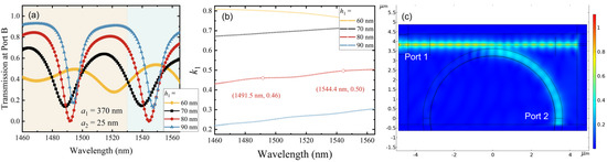 (a) Transmission at Port B and (b) coupling coefficient k1 of VμRC at h1 = 60, 70, 80, and 90 nm when a1 = 370 and a2 = 25 nm. (c) Electric field distribution at the wavelength of 1544.4 nm.