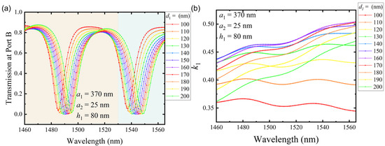 Apart from the thickness of the InP waveguide, the coupling distance between the InP waveguide and the microring also plays a pivotal role in determining the transmission spectrum. To investigate this, we vary the coupling distance (d1) between the InP waveguide and the VμRC while keeping a1 = 370, a2 = 25, and h1 = 80 nm constant. As shown in Figure 5a,b, the transmission at Port B and the corresponding coupling coefficient k1 of VμRC are simulated and plotted for different d1 values. Notably, as the coupling distance increases, the entire transmission spectrum of Port B redshifts, and the coupling coefficient k1 exhibits a trend of first increasing and then decreasing. The maximum coupling coefficient between the InP waveguide and the microcavity is found at d1 = 160 nm. Specifically, when d1 = 160 nm, the coupling coefficients at the peak wavelengths of 1491.57 and 1544.4 nm was 0.46 and 0.5, respectively. Collectively, these results suggest that for the coupling process from the InP waveguide to the microring, the optimal parameters are a thickness of 370 nm for the SiNx layer, 25 nm for the silicon layer, and 80 nm for the upper InP waveguide and a coupling distance of 160 nm. Under these conditions, we can obtain the highest coupling efficiency from the InP waveguide to the VμRC.
