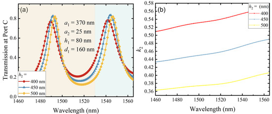 (a) Transmission at Port C and (b) coupling coefficient k2 of VμRC at h2 = 400, 450, and 500 nm when a1 = 370, a2 = 25, h1 = 80, and d1 = 160 nm.