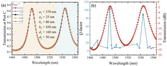 (a) Transmission at Port C of VμRC at nSOG = 1.1, 1.2, 1.3, 1.4, and 1.5 when a1 = 370, a2 = 25, h1 = 80, h2 = 450, d1 = 160, and d2 = 50 nm. (b) Q-factor and transmission of the VμRC.