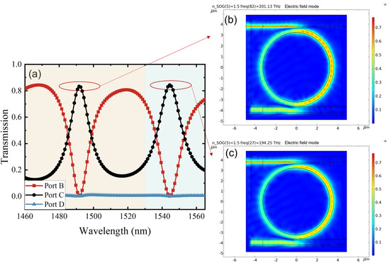 Subsequently, drawing upon the comprehensive set of simulation outcomes, successfully obtain the transmission spectra of the VμRC at Ports B, C, and D, as exemplified in Figure 9a. Notably, these spectra are acquired under the following dimensional parameters: a1 = 370, a2 = 25, h1 = 80, h2 = 450, d1 = 160, and d2 = 50 nm. Regarding the parameters a1 and a2, which denote the thicknesses of silicon nitride (SiNx) and amorphous silicon (a−Si), respectively, we observe that these parameters critically influence the effective diameter of the annular cavity. Consequently, increases in a1 and a2 lead to the resonances becoming more narrowly defined and deeper. The dimensions of h1, h2, d1, and d2 are found to significantly impact the coupling coefficient, thereby affecting the coupling efficiency directly. Our analysis aims to identify their optimal values to enhance system performance. We also note that variations in the refractive index of the Spin−On−Glass (nSOG) exhibit negligible impact on the transmission spectrum, aligning with our simulation results. Additionally, the electric field distributions of the coupling peaks from 1460nm to 1565 nm are depicted in Figure 9b,c, respectively. For the VμRC under investigation, the coupling wavelengths are determined to be 1491.57 and 1544.4 nm, respectively. As we proceed towards the subsequent stages of actual device fabrication, it is crucial to acknowledge that the VμRC is a three-dimensional entity. The comparison between the simulation results and the optimal parameters obtained in previous experiments [15,17,18] shows that the values of parameters a1, a2, and d2 are consistent. As for h2, a large waveguide thickness helps to enhance the coupling between the microring and the waveguide; improvements need to be made in future experiments.