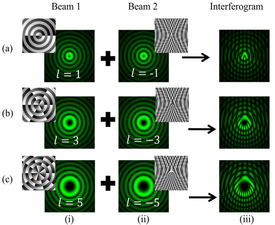 Simulation results of an in-line interferogram obtained after interference of BG beams with a Gaussian beam. Column (i): intensity distributions of BG beams of different orders l = 1, 3, 5, and 10 as depicted in rows (a–d). Column (ii): intensity distributions of Gaussian beams. Column (iii): intensity distributions of fringe patterns.
