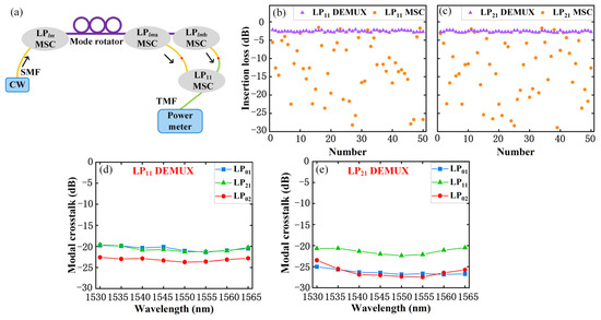 The demultiplexing stability for LP11 and LP21 modes are investigated with the setup shown in Figure 3a. The two LP11 (LP21) MSCs are cascaded by fusion splice and the orthogonality is achieved by adjusting the FMF between them. The combiner LP11 MSC is also connected by fusion splice. The lengths of the two input pigtail fibers of the combiner LP11 MSC are precisely controlled to ensure the two branches before the combiner are identical. Optical power is launched through an LP11 (LP21) MSC stimulated by a tunable continuous-wave (CW) laser. The mode rotator is inserted before the demultiplexer to rotate the lobe orientations as well as polarization of input modes, and the output power of the demultiplexer is measured by a power meter. The mode rotator is a three-paddle polarization controller wound by the FMF. The insertion loss (IL) and power stability of regular MSCs for mode demultiplexing are also measured for comparison. IL is measured 50 times by randomly adjusting the mode rotator and the results are shown in Figure 3b,c. Only slight power fluctuation is observed for the proposed degenerate mode demultiplexers, while the power fluctuation for regular MSCs is quite large. The modal selectivity is evaluated by exciting each of the other three LP modes one by one. The wavelength of probe signal is tuned over the C-band and the results are shown in Figure 3d,e. The modal crosstalk of all modes is lower than −21 dB at 1550 nm and lower than −19.6 dB over the C-band.