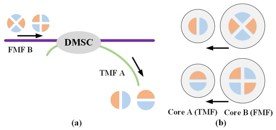 The scheme based on all MSCs requires a two-step process of converting and combining which will inevitably introduce external IL. In addition, the length of the optical paths of the two branches should be strictly identical during the combining so as to avoid temporal delay. In order to solve these problems, a degenerate-mode-selective fiber coupler is proposed for the reception of the degenerate modes. From the perspective of dimensions, if the optical powers in both degenerate modes are converted by the DMSC into a single output fiber, the fiber should sustain at least two spatial degrees of freedom. Consequently, the output fiber has to be an FMF. A straightforward approach is to make the output fiber the same as the original FMF. Then, the DMSC will be a symmetric two-core few-mode fiber coupler. However, this is not the best solution. On one hand, the modal selectivity of the DMSC will vanish by using two identical fibers. This is because the phase-matching conditions are always satisfied between two identical FMFs and the DMSC will inevitably extract energy from unwanted modes. On the other hand, the output fiber of the DMSC is commonly coupled to a PD for optoelectronic conversion. Fibers with smaller core diameters are easier to couple to high-speed PDs with smaller effective areas. Because all degenerate modes only have the same two-fold degeneracy, utilizing a TMF as the output fiber will provide enough dimensionalities and be very useful. Consequently, the DMSC is an asymmetric few-mode fiber coupler which consists of an input FMF and an output TMF, as shown in Figure 4a. In addition, since the LPlma and LPlmb modes can only couple to the same kind of degenerate modes, the proposed LPlm DMSC functions as two independent few-mode couplers. As can be seen in Figure 4b, the LPlma mode of the core B couples to the LP11a mode of core A, and the LPlmb mode of the core B couples to the LP11b mode of the core A.