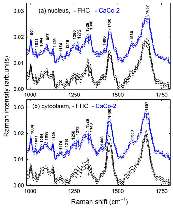 Similar spectra have been reported by other authors about colon cells [29,30] and tissues [31]. In particular, all spectra in Figure 1 show many peaks, due to Raman scattering of distinct functional groups located within the cellular components. The assignment of spectral features, in agreement with the results of the previous literature [32], is shown in Table 1. In particular, the most intense peaks in the spectra in Figure 1 are due to the contribution of the amide I (~1657 cm−1) and CH2 deformation (~1450 cm−1) peaks. Other well-resolved protein-related peaks include amide III (~1260 cm−1), phenylalanine ring breathing vibrations (1004 cm−1), C-N stretching (1088 and 1129 cm−1), and aromatic ring vibrations associated with phenylalanine, tryptophan, and tyrosine (e.g., 1031, 1174, and 1210 cm−1). The contribution of DNA and RNA components is more evident in the spectra measured in the nucleus region than in the cytoplasm one; it is mostly related to the peaks at 1097 cm−1 (PO2− phosphodioxy bond of the phosphate group), 1326 and 1340 cm−1 (CH3CH2 wagging mode in purine bases of DNA and ring breathing modes of DNA/RNA bases, respectively), and 1580 cm−1 (ring breathing vibrational modes characteristic of adenine and guanine). Lipid components weakly contribute to the Raman spectra in Figure 1. In particular, a well-resolved lipid-related peak is located at 1064 cm−1, where other lipid peaks are mainly overlapped with the protein ones, as occurs at 1088, 1129, and 1450 cm−1.